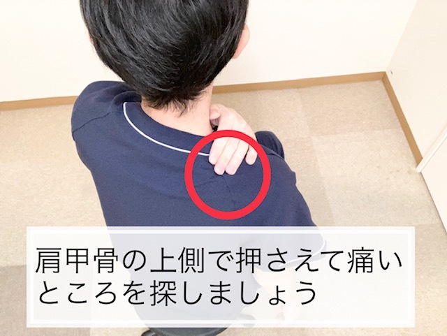 肩甲骨の上側を抑えて痛いところ(凝っているようなところ)を探してみてください。