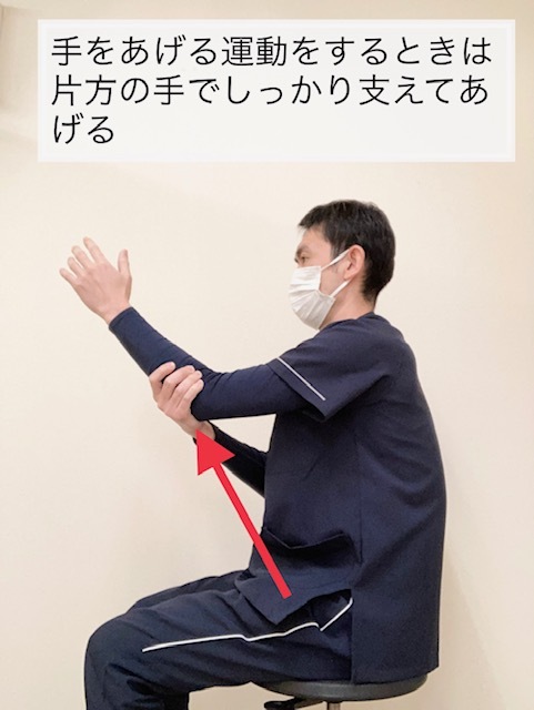 また、片手で上げるのがつらい時は、痛くない方の手で支えてあげながら行ってください。