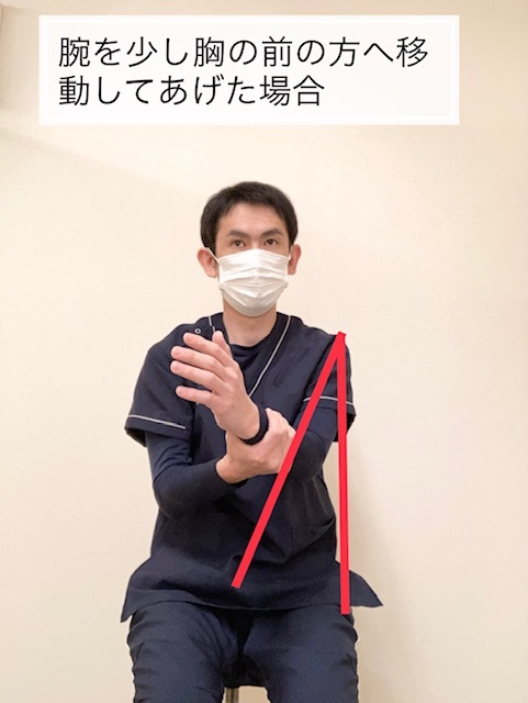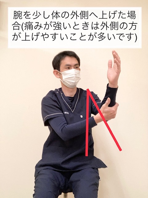 手のひらを内側に向けて腕を上げても痛みが強い場合は、腕を上げる位置を少しずつ変えてみましょう。