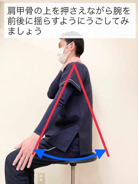 痛いところが見つかったら痛いところを抑えたまま腕の力を抜き腕を軽く前後に揺らしましょう。