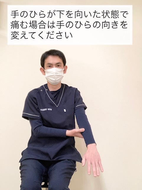 手のひらが下を向いた状態で腕を上げると痛みが強く出てしまう可能性があります。