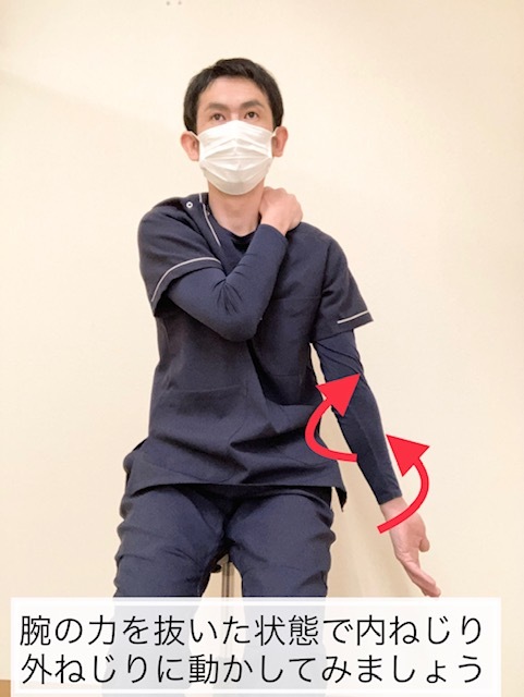 前後に揺らす運動ができたら腕を内回し外回しに軽くねじる運動を行ってください。