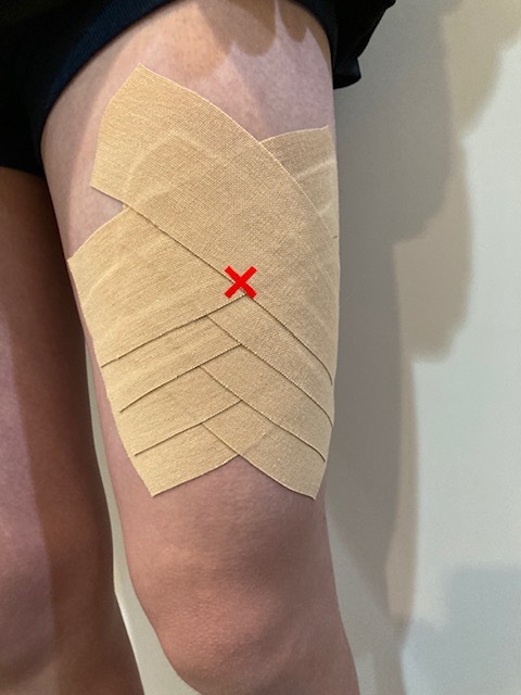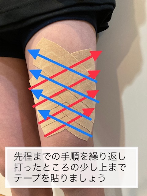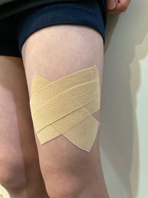・痛むところの少し下の方から✖️を作るように痛むところの少し上までテーピングで押し付けるように貼りましょう!
