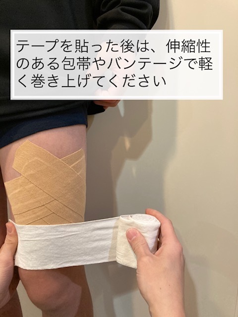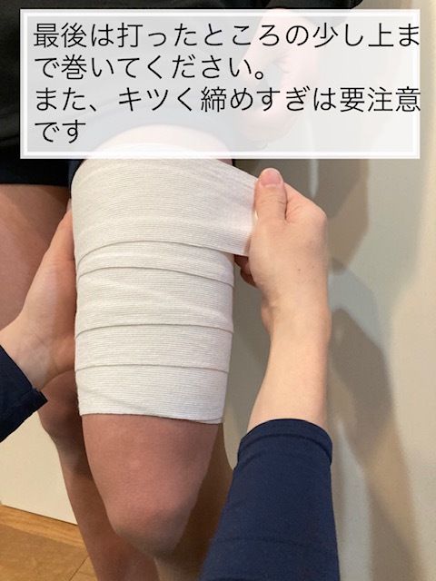 ・そこから太もも全周を包帯などで膝上から股関節下までしめすぎないように巻いてあげましょう。