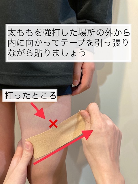 ※打撲した日は、このような処置をしていただき次の日の試合は包帯の代わりにテーピングで膝上から足の付け根を巻いてあげるといいと思います。