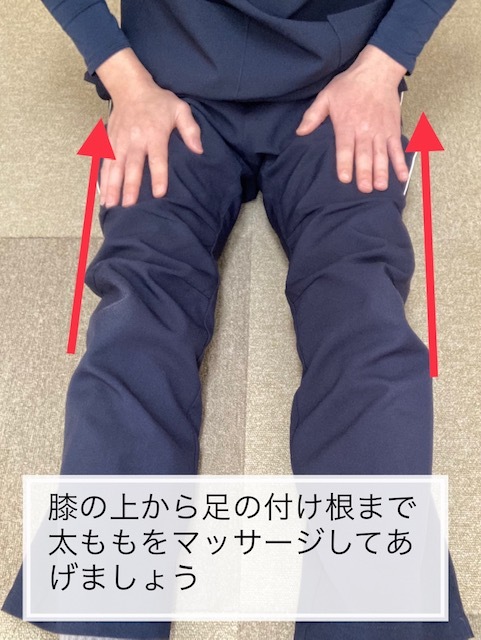 手のひらを使って膝上から足の付け根まで優しく筋肉を揺らすようにマッサージを行ってみてください。