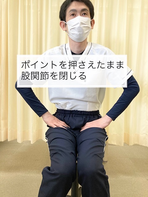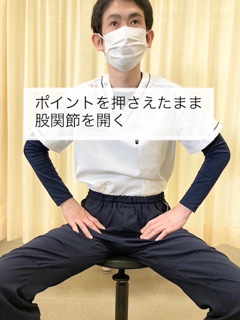・押さえることができたら足の付け根を外に開いたり内に閉じたりする動きを5回程度繰り返し行ってください。