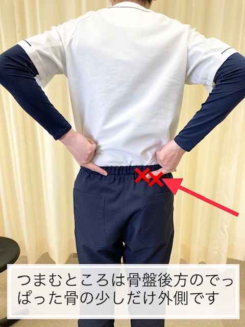 ・座った体勢で骨盤の後の出っ張った骨のすぐ外側をつまんでもらいましょう。