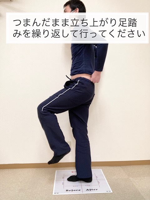・つまんでもらったらそのまま立ち上がります。そこから軽く足踏みを10回程度行ってください。