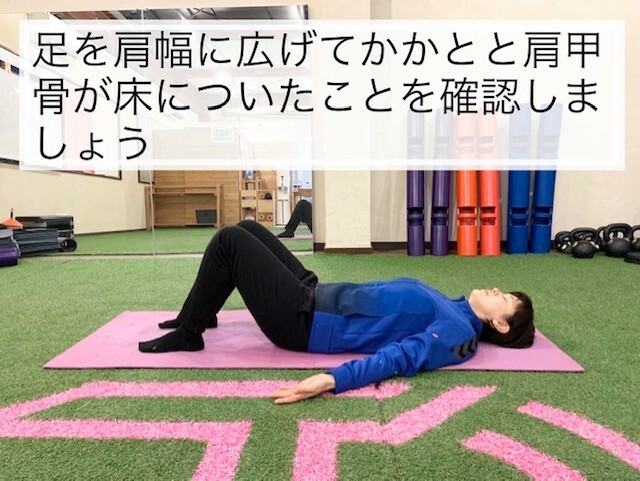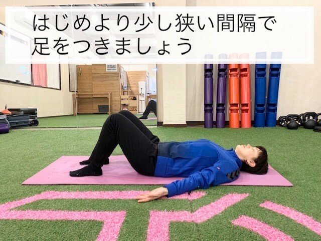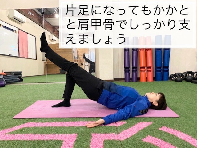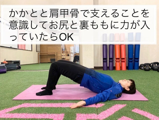 ②お尻を上げる時は、お尻を締めるように意識して上げましょう。足裏にかかとと肩甲骨で体を支えるようにすると効果的です。。