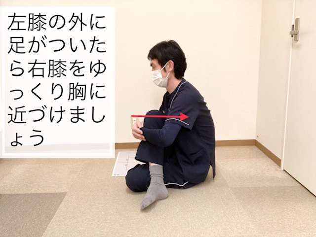 足を外側へ着くことができたら、胸の方へ膝を抱くように引き寄せます。
