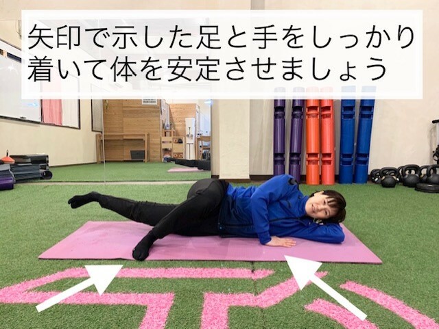 ①横向きに寝て、上側の足を反対側のひざの前に立て、手は胸の前あたりに着くようにしてください。下側の足は膝を伸ばした状態でまっすぐになるように意識してみましょう。