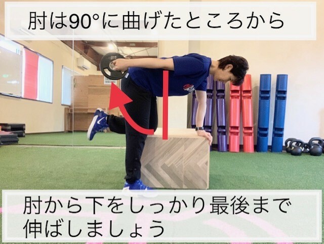 ③反動を使わずに肘を伸ばす。この時、二の腕に力が入っているのを確認してください。