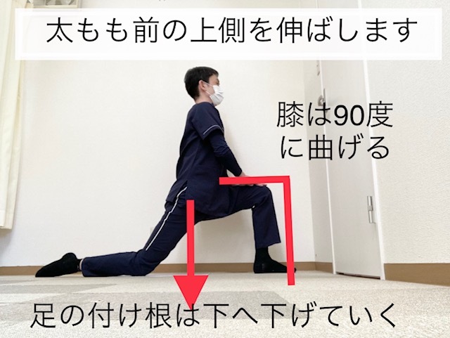 膝が90度になるまで体を前に移動できたら、後ろへ伸ばしている方の足の付け根が下に沈むように意識してみましょう。