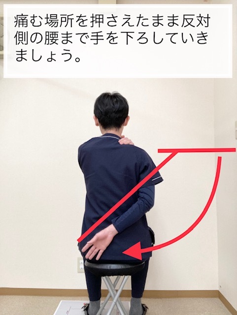 押さえることができたら、痛い場所を押さえたまま、手をあげている方と逆の腰の方まで下ろしていきましょう。