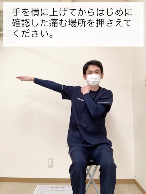 肩を横へ上げた状態で痛い場所を押さえてください。