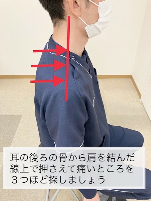 耳の後側のすぐ下にあるでっぱった骨から肩の外側にあるでっぱった骨を結んだライン上で押さえて痛い場所を3箇所ほど探してください。