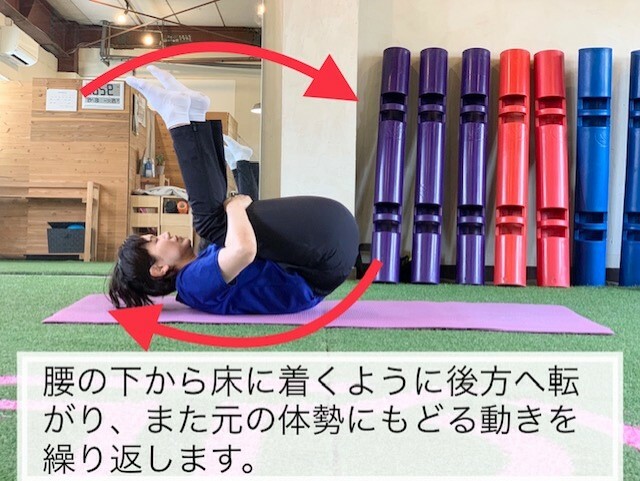 あまり勢いが強いと危ないので、少しずつ転がる範囲を広げてお尻が浮いて肩までいけたらOKです。