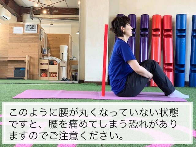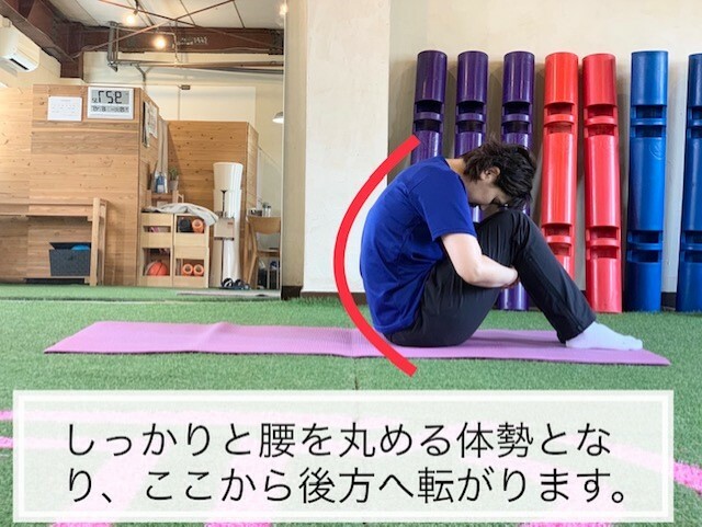 腰がまっすぐだとうまく転がらず腰に力が入るので、必ずスタート前に丸くなって行ってください。