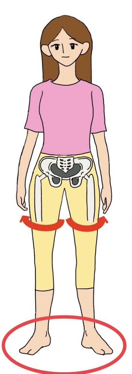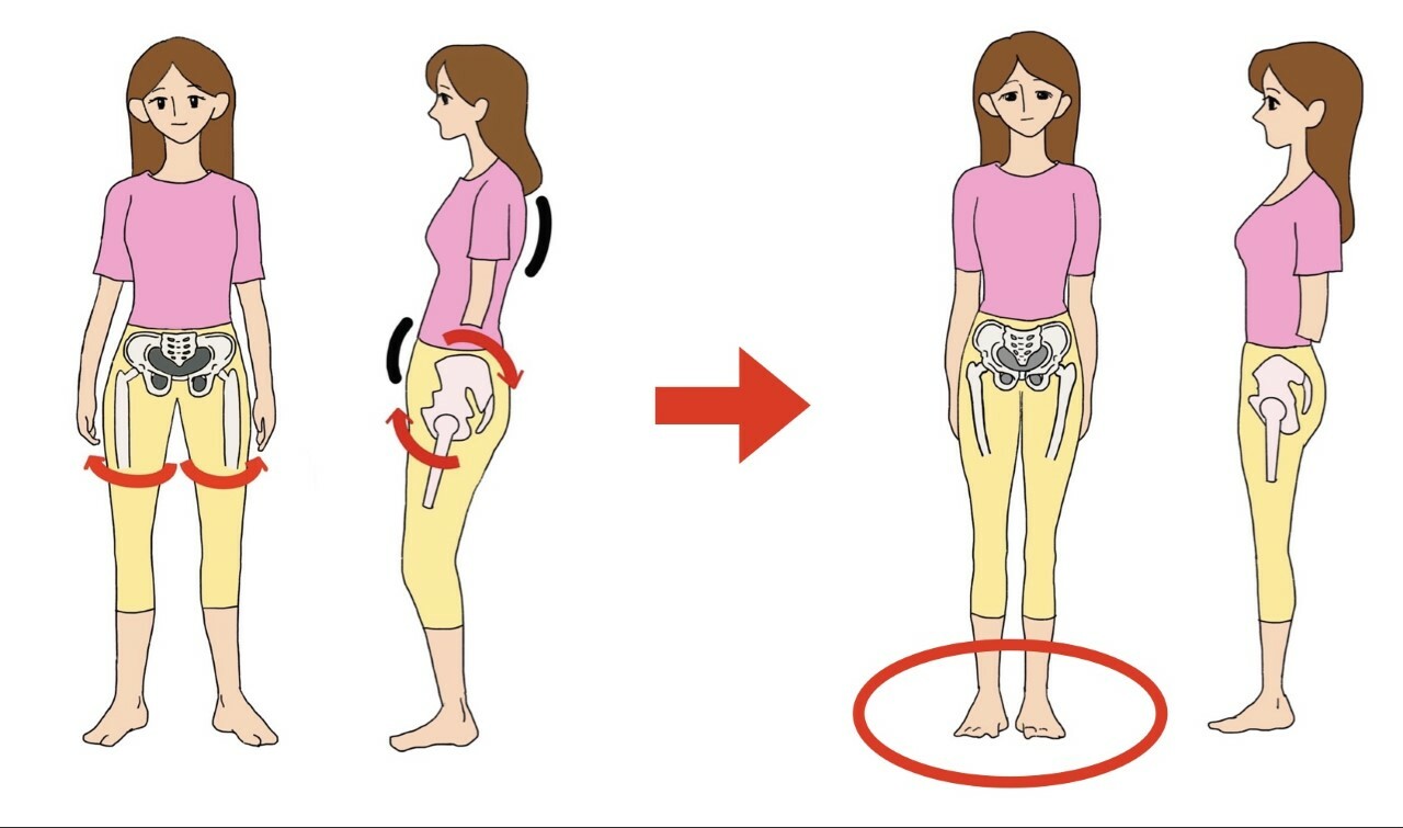 つま先の向きが外を向いている場合は、骨盤が後方へ倒れやすく腰から背中が丸くなり、顔が前方へ出やすい姿勢となってしまいます。