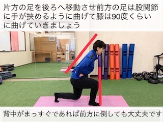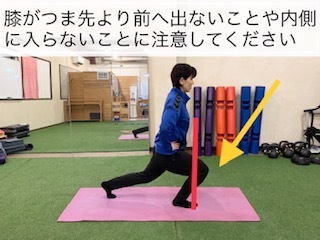 注意②前方の足はひざがつま先より前に出てしまわないようにして、曲げる角度は90度くらいにしておきましょう。