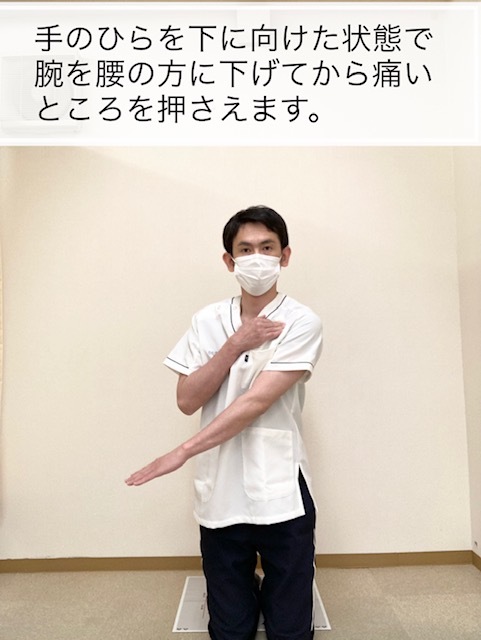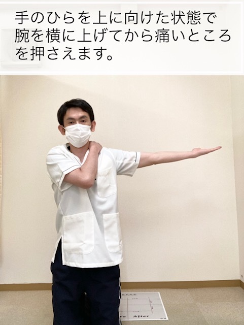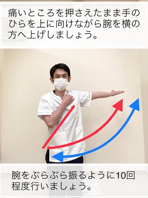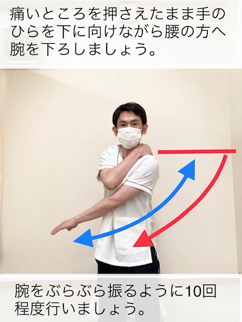 あとは、痛い場所は押さえたまま腕を行ったり来たりぶらぶらと10回程度繰り返し動かしてください。