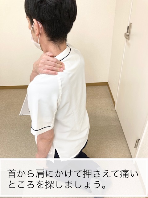 まず、首から肩にかけて押さえて痛い場所を探しましょう。