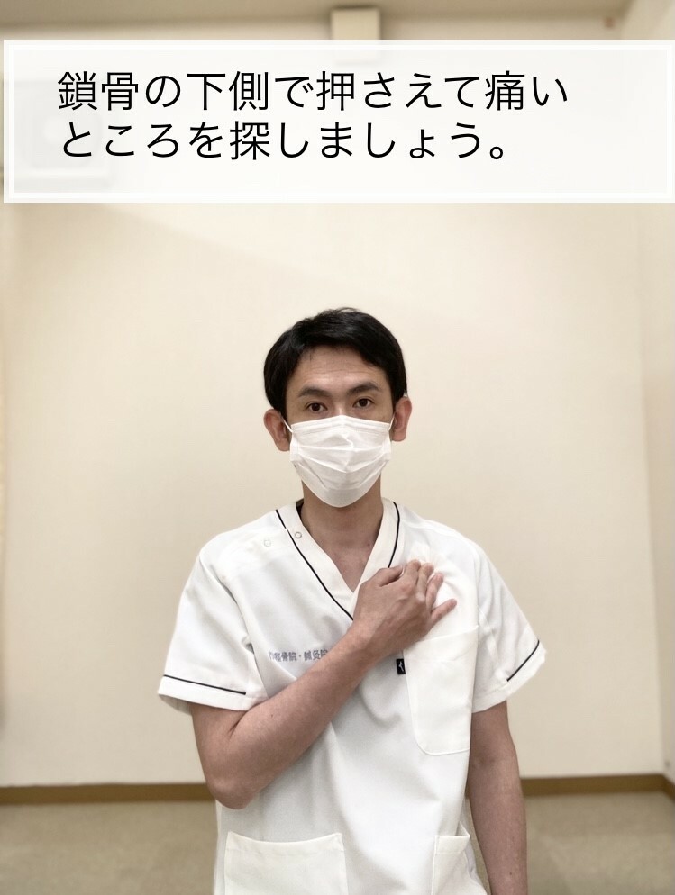 まず、鎖骨下の肩よりで押さえて痛い場所を探しましょう。