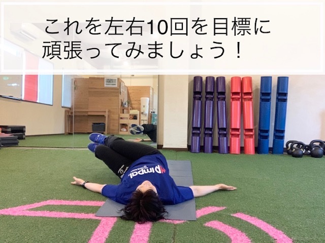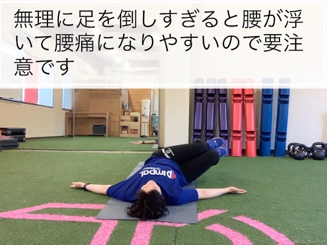 ここでの注意点は、倒した膝と逆の肩が浮かないところで、お腹と横腹で止める。お腹で止めないと腰を痛める原因となる。