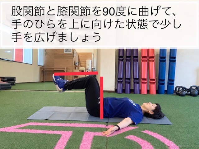 ①仰向けに寝た状態で手のひらを上に向けて肩を45度ほど広げましょう。