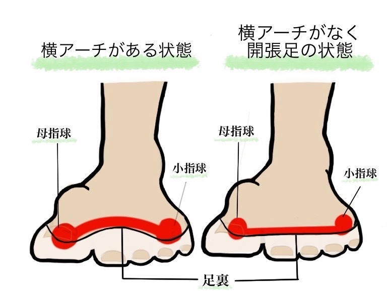 開張足とは親指と小指が広がった状態で横アーチが少ないことをいいます。