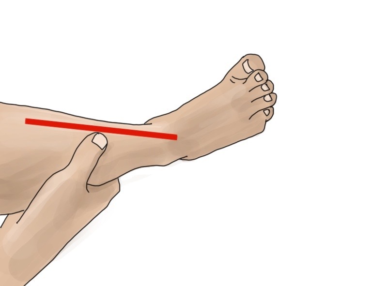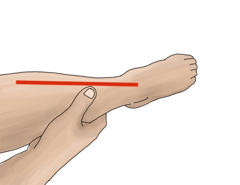 足首をそらした状態にして、膝下のすね外側を押さえます。