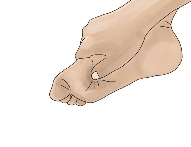 親指を曲げた状態にして、母指球の膨らんだところより少しかかとよりを押さえます。