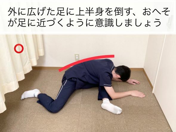 ③上半身を広げている足の方へ向けることができたら、そのまま足の方へ上半身を倒しましょう