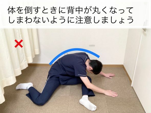 ③のところで上半身を倒すときに背中が丸くならないようにおへそが足に近づくイメージで上半身を倒す意識を持ちましょう