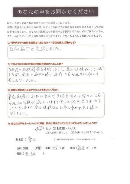 夜も眠れないようなこむら返りや痛みを耐えておられてどうしようもなくなり、お友達のご紹介でご来院くださったAさんが回復されて、ご紹介してくださったお友達も非常に喜んでおられました。