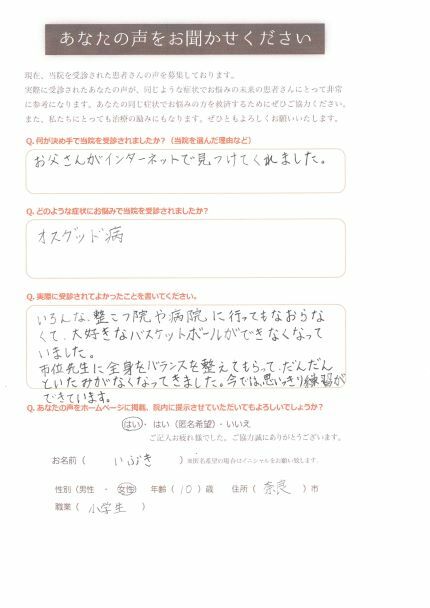 はじめはバスケットボールをしている最中でも痛みで泣いてしまうことがある程の痛みだったことが、今では思いっきりバスケットボールができるまでに回復され非常にうれしく思っております。