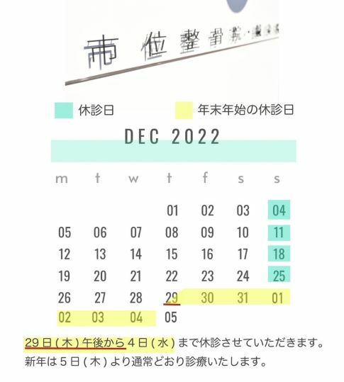 市位整骨院・鍼灸院 年末年始の診療日程