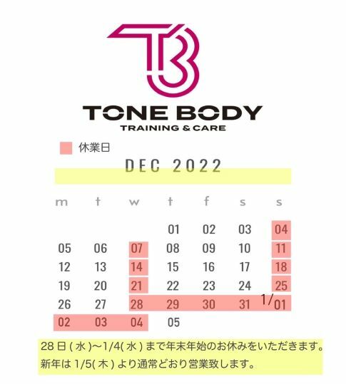 今日は当院グループであるスポーツジムTONEBODYの年末年始営業日についてのお知らせです。