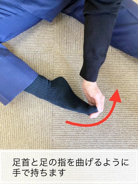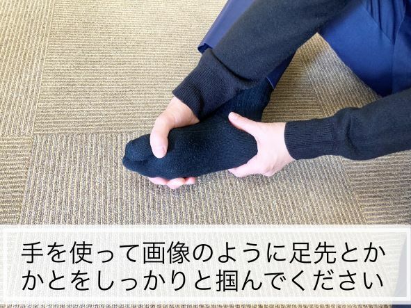 ・右手で足の甲側から足の前足部をつかみ、左手で足裏側からかかとをつかみます