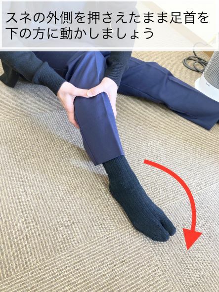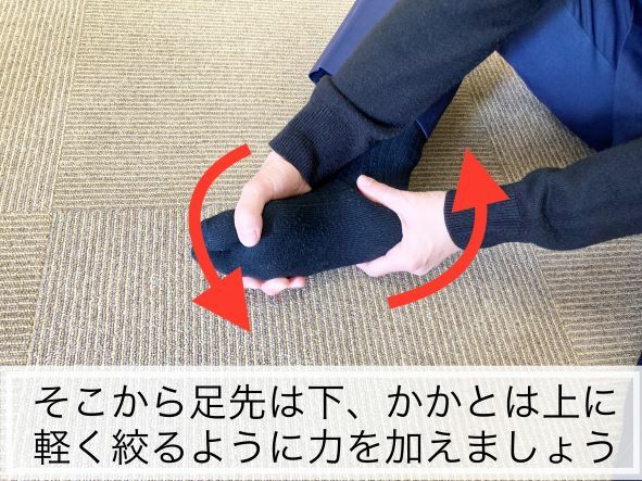 ・両方つかむことができたら、前足部を下側へかかとを上側へ軽くねじるような動きを加えてください