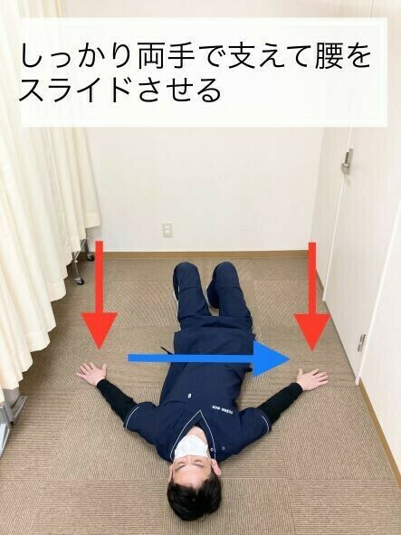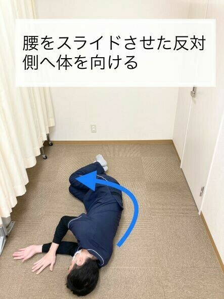 ・目が覚めて足や肩など動かせるところを少し動かした後に、体勢を変えるときは両手でしっかりと床を押さえながらお尻を少しずつ横にスライドさせるように動きましょう