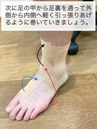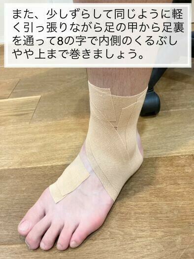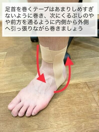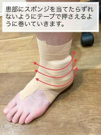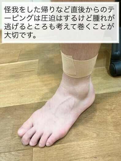 足首捻挫をするとアイシングの後に固定してあげることも重要です。①でも例にあげたように皮膚の中では色々な組織が傷つき出血している可能性があります。