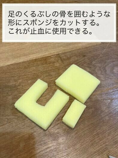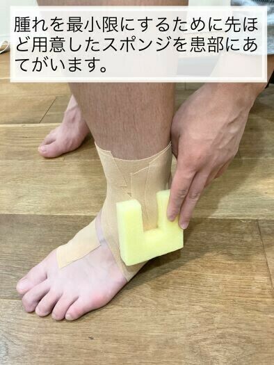 食器洗いスポンジなどを足首のくるぶしを囲むようにUの字に切り、それをくるぶしにあてがい包帯などで締め上げないように柔らかく固定してあげることです。