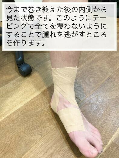 捻挫した日は固定したままの方がいいような気もしますが、足首全体を覆うように圧迫し続けると内圧が高まり次の日の朝に痛みが増していることがあるので、固定はしてもテーピングの間から皮膚がのぞくことができる程度で大丈夫です。