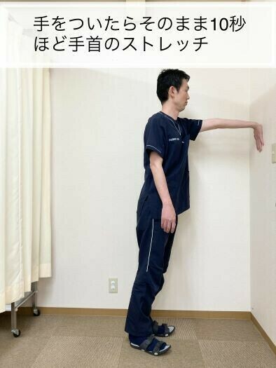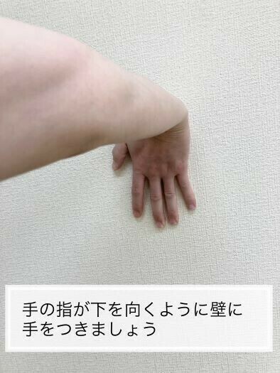 肘から手首にかけてストレッチできている感覚が出たら10秒くらいその体勢を維持してゆっくりした呼吸を行いましょう。