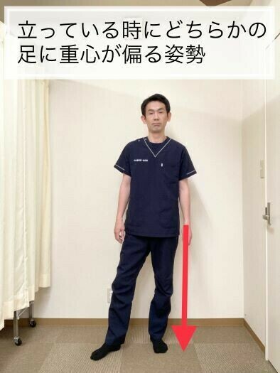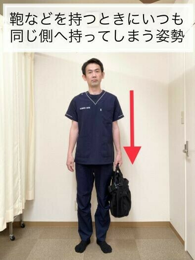 人によって聞き手や聞き足と呼ばれるものがありますが、その聞き手や聞き足には関係なく写真のように手ぶら下げた状態で荷物を持つ方であったり、立っている時によく体重をかける方に腰の軸を置いているの可能性が高いです。