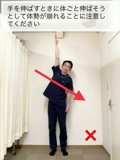 ・手を上に伸ばす際に方から上に上げようよしたり、腰を移動させるような感じになってしまうと効果が表れにくいので写真のような体勢にならないように意識してください。