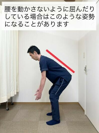 例えば、洗面のときに足を曲げて腰は曲げないようにしているとか他にもあると思いますが、写真のような体勢から腰を動かさないようにしてしまうと腰に動きが出ないようになってしまいます。