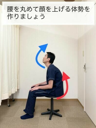 ①椅子に座っている体勢から悪い姿勢を作るように腰を丸めましょう。
